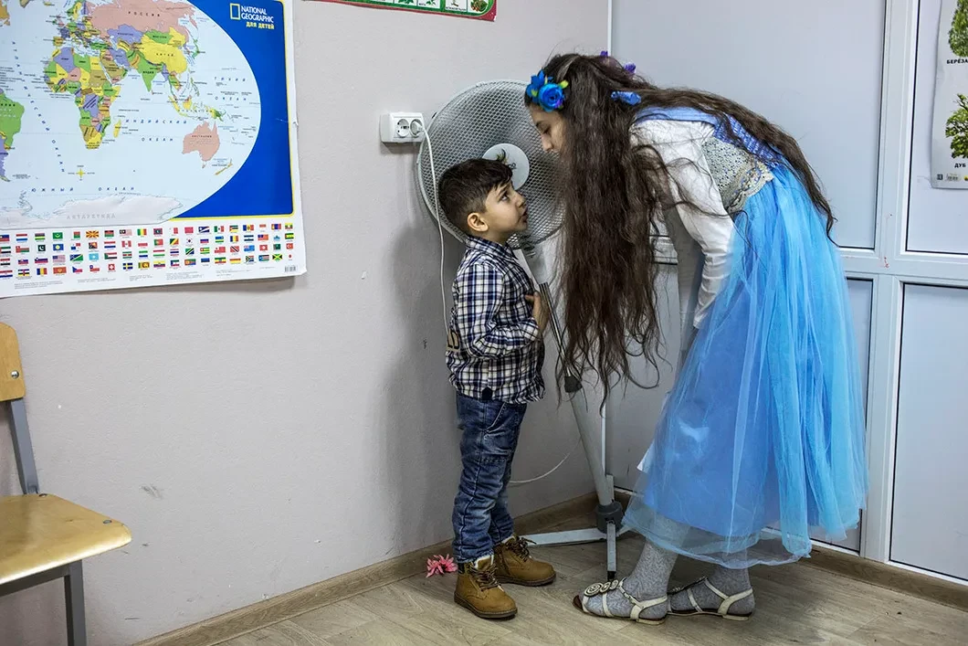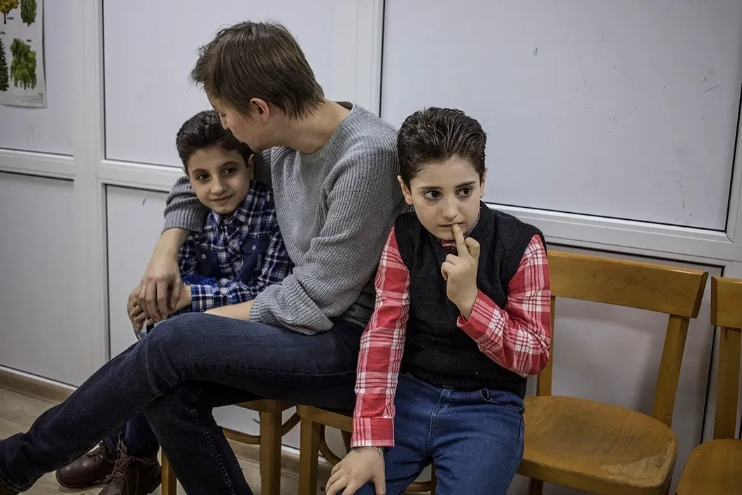 На совместную фотографию детей собрать не удается: все разбежались по разным уголкам. В большом кабинете остается восьмилетний мальчик Хасан. Со мной он поговорить согласился неохотно, видимо, испугался незнакомого человека. Евгений подошел к нему, сел на корточки, чтобы их лица оказались на одном уровне друг с другом, и сказал: «Хасан, смотри. Эта девушка хочет написать историю. Ей нужен сирийский мальчик, который хорошо говорит на русском. Она мой друг».