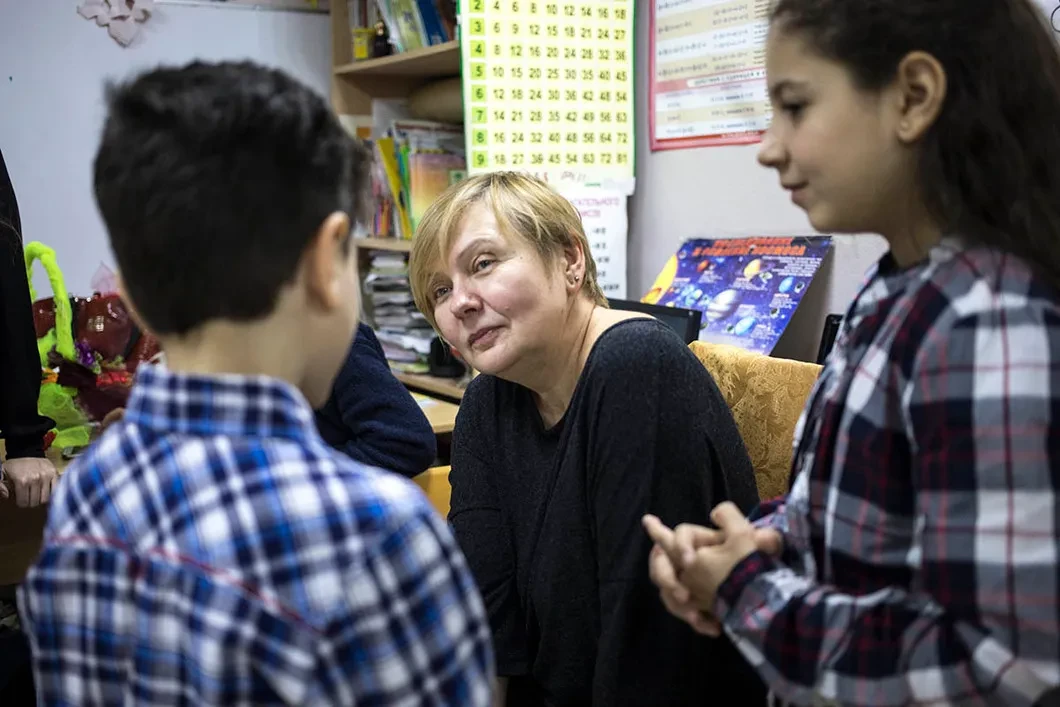 Все они разного возраста (от 4 и до 14 лет) и с разным уровнем знания русского языка. «У нас нет строгой системы, как в школе. Урок, перемена, не поймешь даже. Плавно одно в другое перетекает», — рассказывает Елена. Она старается давать ученикам общие знания по математике, географии и биологии: «У них даже на уровне арабского этого нет. Однажды я спросила у одной мамы, какие страны она знает? Россия, Сирия и молчит. А на арабском? Молчит. А какие города знаешь? Дамаск, Москва, Ногинск. И это взрослая женщина!».