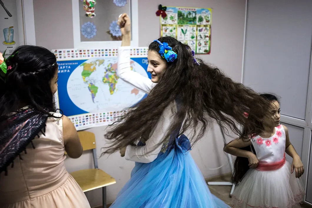 Спустя полчаса после нашего приезда представление начинается. Первыми с танцем под национальную музыку выступают три старших девочки. За ними на импровизированную сцену выходят младшие и устраивают хоровод. Дети двигаются немного неумело, но с огромным старанием — так, что со стен слетают плакаты с русским алфавитом и таблица умножения.
