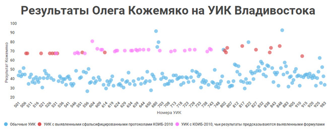 Подробнее. По данным «Голоса», скоординированные фальсификации проходили на 47 из 80 участков с КОИБ-2010: итоговые протоколы с этих участков имеют несколько признаков подделки и все фиксируют результат Кожемяко выше среднего по региону.