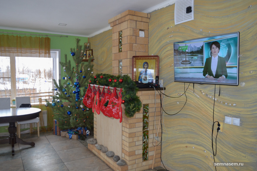 В столовой пансионата, украшенной к Новому году, нас встречают его жители, а также пять кошек, которые тоже «прописались» в «Доме Вероники».