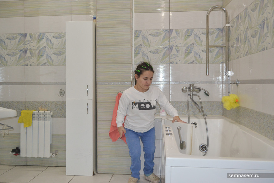 Любой житель «Дома Вероники» может самостоятельно принять ванну и воспользоваться удобствами. Для этого здесь есть специальная дверца, чтобы можно было зайти в чашу ванны без помощи сопровождающих, и раковина, которая регулируется по высоте.