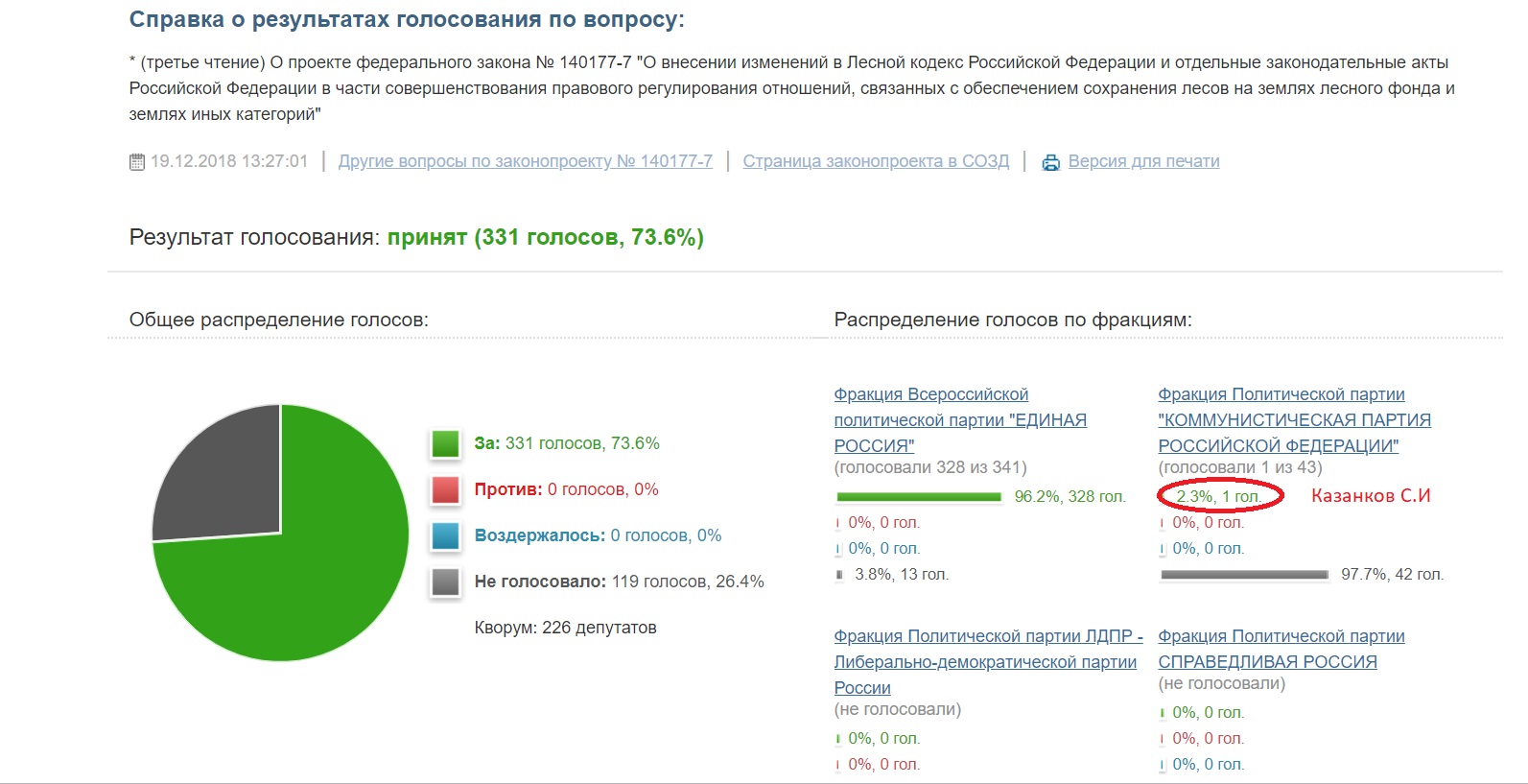 Депутат Госдумы от КПРФ Сергей Казанков попытался оправдаться перед своими избирателями (за голосование вместе с Единой Россией) и попытался обвинить экологов в лоббировании интересов “кедровой мафии”.На страницах в социальных сетях Сергей Казанков заявил, что “конкретно по этому законопроекту фракцией КПРФ было принято решение голосовать самостоятельно. Большинство моих коллег не голосовали ни за, ни против”.