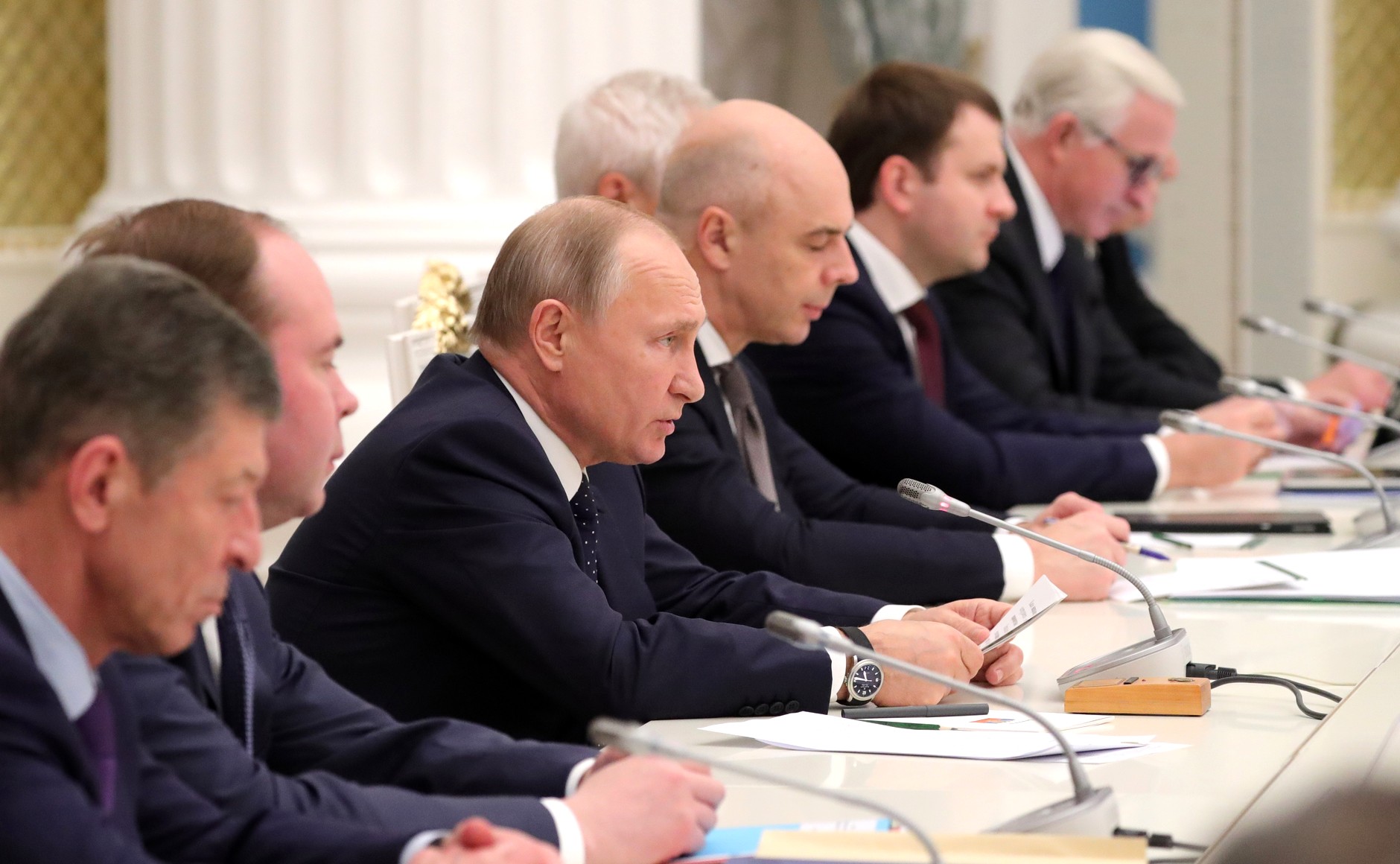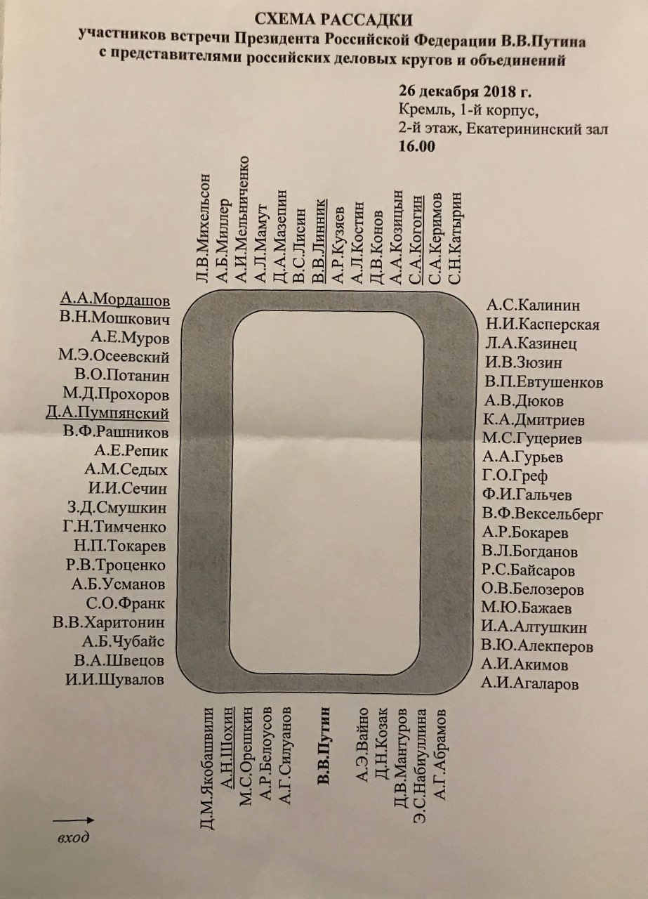 Контекст. Согласно схеме рассадки, на встречу с президентом пришли президент «Роснефти» Игорь Сечин, президент Infowatch Наталья Касперская, председатель правления «Сибур» Дмитрий Конов, президент «Ростелекома» Михаил Осеевский, предправления «Газпром нефти» Александр Дюков, председатель совета директоров группы компаний «Ренова» Виктор Вексельберг, глава «Русагро» Вадим Мошкович, миллиардер Михаил Прохоров и другие.