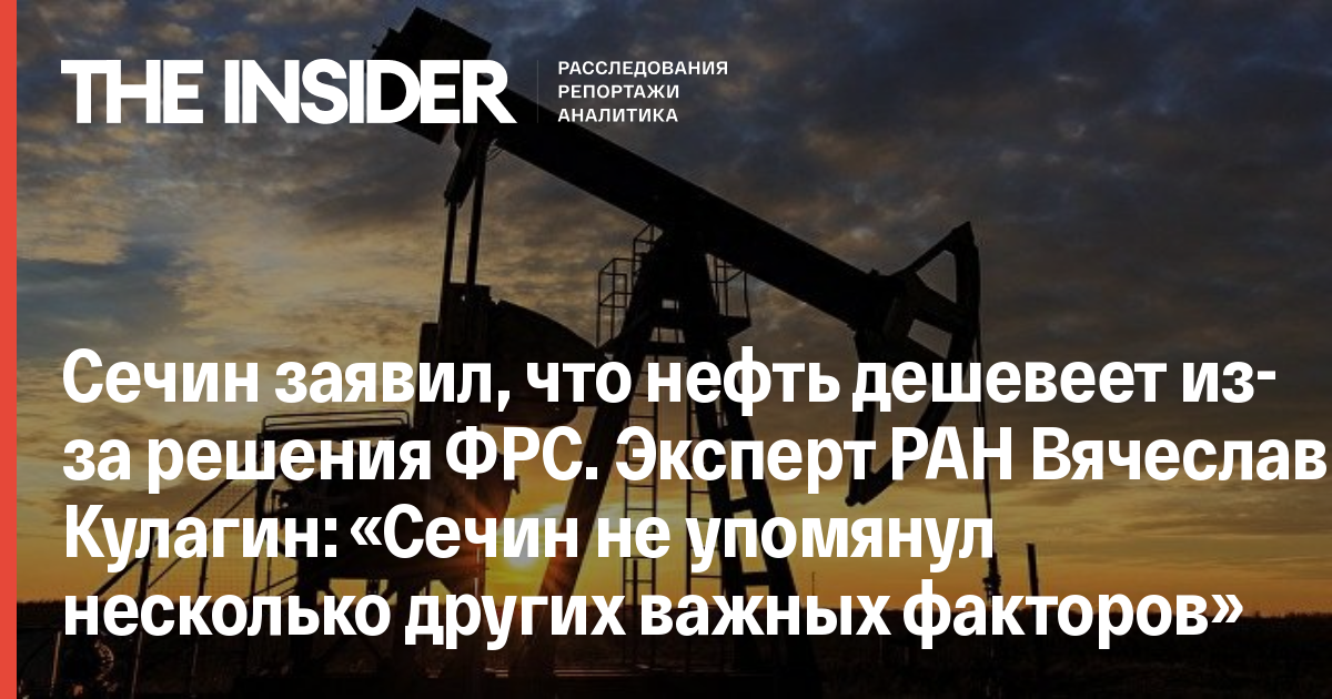 Сечин заявил, что нефть дешевеет из-за решения ФРС. Эксперт РАН Вячеслав Кулагин: «Сечин не упомянул несколько других важных факторов»