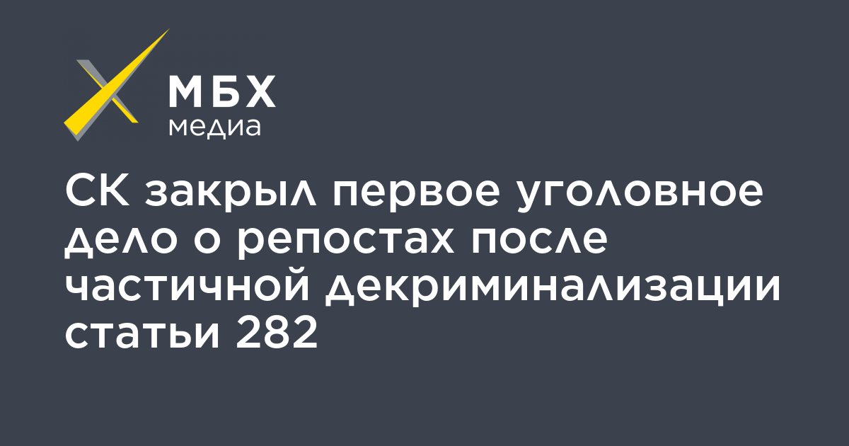 Следственный комитет (СК) закрыл первое уголовное дело о репостах после принятия закона о частичной декриминализации статьи 282 УК, об этом сообщил глава международной правозащитной группы «Агора» Павел Чиков у себя в Telegram-канале.