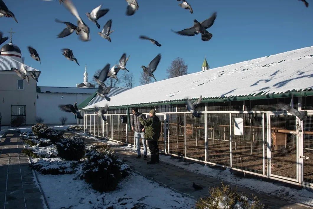 Хозяйственный двор начинается сразу за монастырской стеной. Здесь, в отличие от улицы, шумная жизнь — собаки лают со всех сторон, кошки, мяукая, вьются между ногами. По двору ходят трудники, крякая на холоде, — кто с ведром, кто с лопатой. Все заняты делом — на огромное хозяйство всего девять работников, так что отдыхать времени нет.