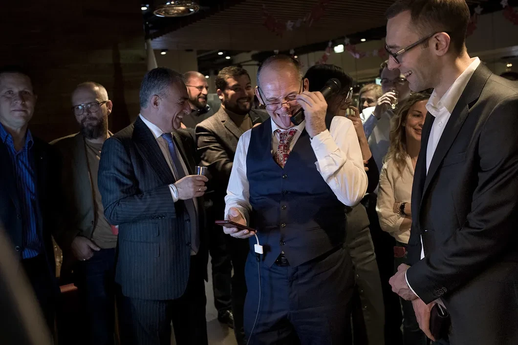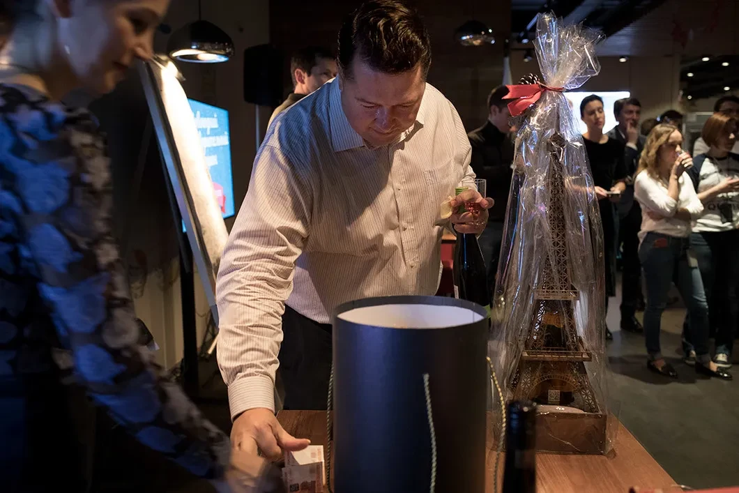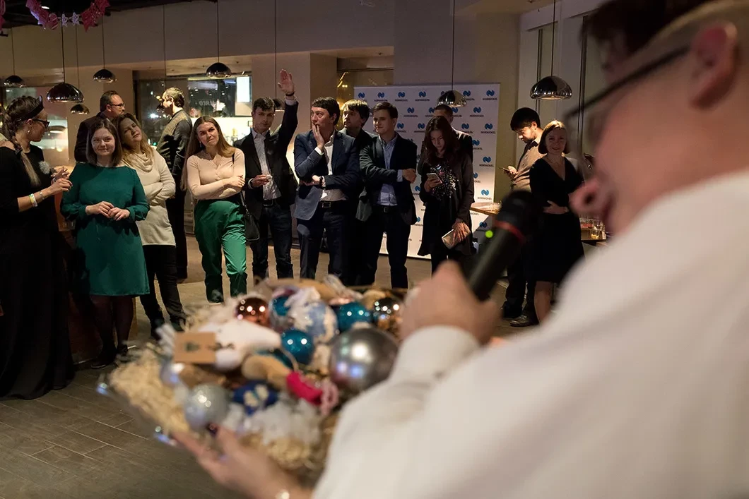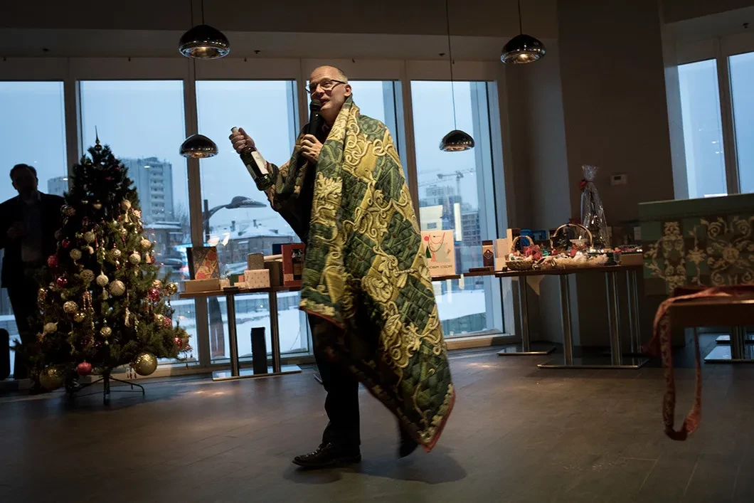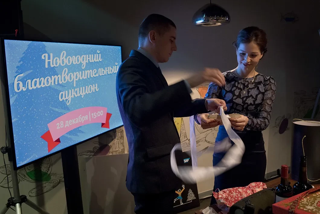 Топ-менеджеры компании участвуют в благотворительном аукционе. Фото: Анна Артемьева / «Новая газета»— 15 тысяч — это что, вино?— Нет, это счастье!— Тогда 20!— Продано! Фото: Анна Артемьева / «Новая газета»После того, как сотрудники фонда «Вера» сказали, что пациентам хосписа «можно все», часть выкупленного алкоголя передавали туда. В этот новый год в хосписе будут пить «Вдову Клико», «Белугу» и другие элитные напитки. Фото: Анна Артемьева / «Новая газета»Корпоративный подарок от иностранных партнеров уходит за 10 000 рублей. Фото: Анна Артемьева / «Новая газета»«Чем больше мы отдаем, тем больше мы получаем. Я однажды в овердрафт залез, чтобы на благотворительность передать. И потом такая пруха пошла!», — смеются сотрудники «Норникеля». Фото: Анна Артемьева / «Новая газета»Многие подарки были запечатаны и их покупали «вслепую». Фото: Анна Артемьева / «Новая газета»Подсчет собранных на благотворительность денег. Фото: Анна Артемьева / «Новая газета»Ведущий аукциона Никита Орлов считает деньги, которые ему перевели на карточку. «Мы подарили себе отличное новогоднее настроение – напитки и конфетки с аукциона гораздо вкуснее! Уникальная трансформация сущности: мы пьем – а детям только лучше». Фото: Анна Артемьева / «Новая газета»Сотрудницы фондов «Подари жизнь», «Вера» и «Свято-Софийский Социальный дом» благодарят «Норникель» за поддержку. Фото: Анна Артемьева / «Новая газета»