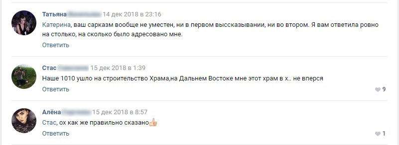 Одобряющих такой сбор пожертвований здесь не нашлось. «Наше 1010 ушло на строительство храма на Дальнем Востоке. Мне этот храм в х.. не вперся», – возмущался Станислав С. «Захотим и храм построим 1010 перекроим, Денег скинем не вопрос Всех спаси Иисус Христос», – вдохновенно строчил Евгений Д. «Деньги заработаем, любовь завоюем, а счастье родим! Всех врагов в храм и пусть там грехи отмаливают!», – предлагала Анна Щ. «Хочу чтобы меня в этом храме отпели», – резюмировал Сергей С.