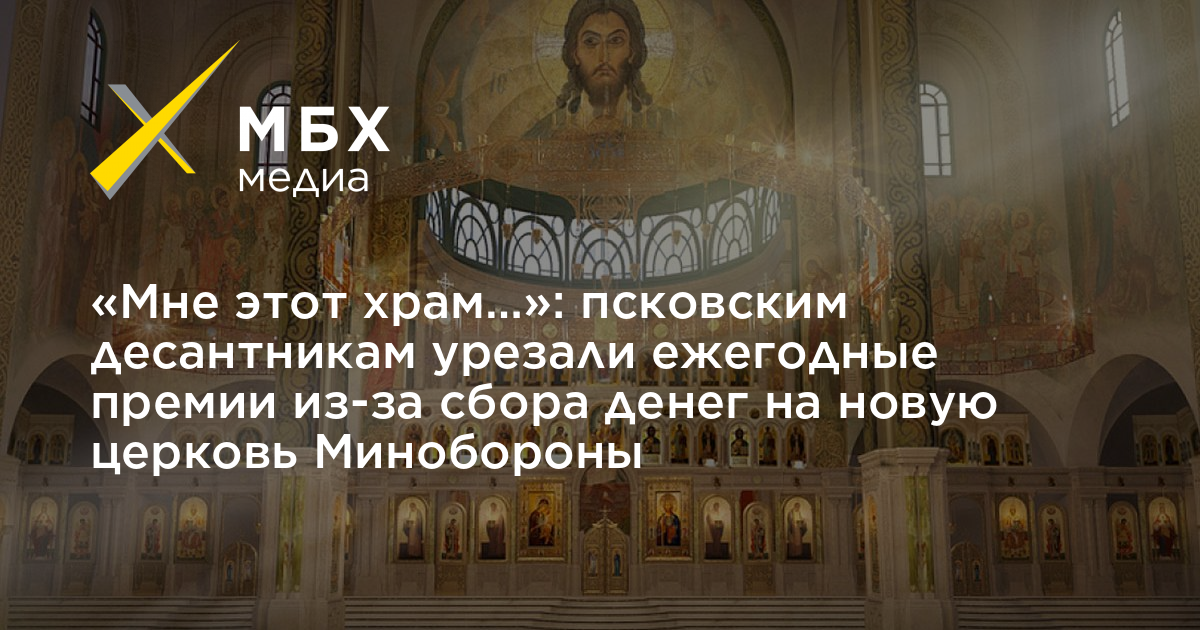 Предновогоднюю премию под кодовым названием 1010 (по номеру приказа министра обороны от 2010 года) семьи псковских десантников, спецназовцев и разведчиков ждали с ноября. Повод был веским: обычно эта декабрьская выплата равнялась минимум трем обычным зарплатам, а у командования и вовсе могла превышать нереальные для региона 100 тысяч рублей. Но в канун Рождества многие служащие обнаружили у себя на карточках «слезные копейки» от 800 рублей до 20 000 рублей. По словам источников «МБХ медиа», на общем собрании руководство объяснило военным, что все деньги ушли на главный храм российской армии, который станет символом духовности русского воинства.