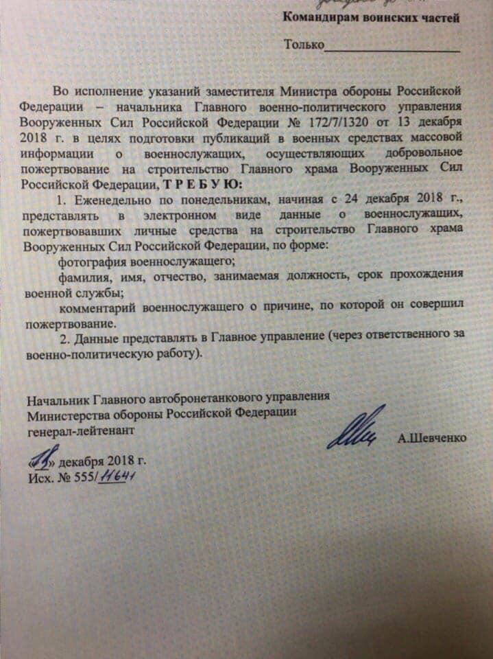 В подтверждение своих слов о том, что большая часть «премий 1010» была отправлена в качестве «добровольного» пожертвования на главный военный храм, некоторые пользователи выкладывали документ, предположительно подписанный начальником главного автобронетанкового управления Министерства обороны Российской Федерации, генерал-лейтенантом Александром Шевченко. В нем от командиров частей требовали «в целях подготовки публикации в военных средствах массовой информации о военнослужащих, осуществляющих добровольное пожертвование на строительство главного храма вооруженных сил РФ», начиная с 24 декабря, каждый понедельник представлять в электронном виде данные о пожертвовавших с указанием ФИО, звания, стажа службы и фотографией солдата». Отдельно автор приказа уточнял, что данные стоит передавать в главное управление через ответственного за военно-политическую работу. Примечательно, что и выплата «премии 1010» в 2018 году началась 24 декабря.
