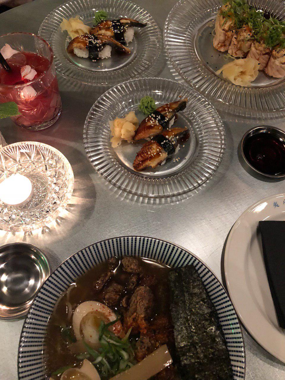 В меню — блюда из сырой рыбы, японские соленья цукэмоно. Кроме того, есть рамены: с говядиной, тигровыми креветками, копченой грудинкой, курицей карааге и яйцом.