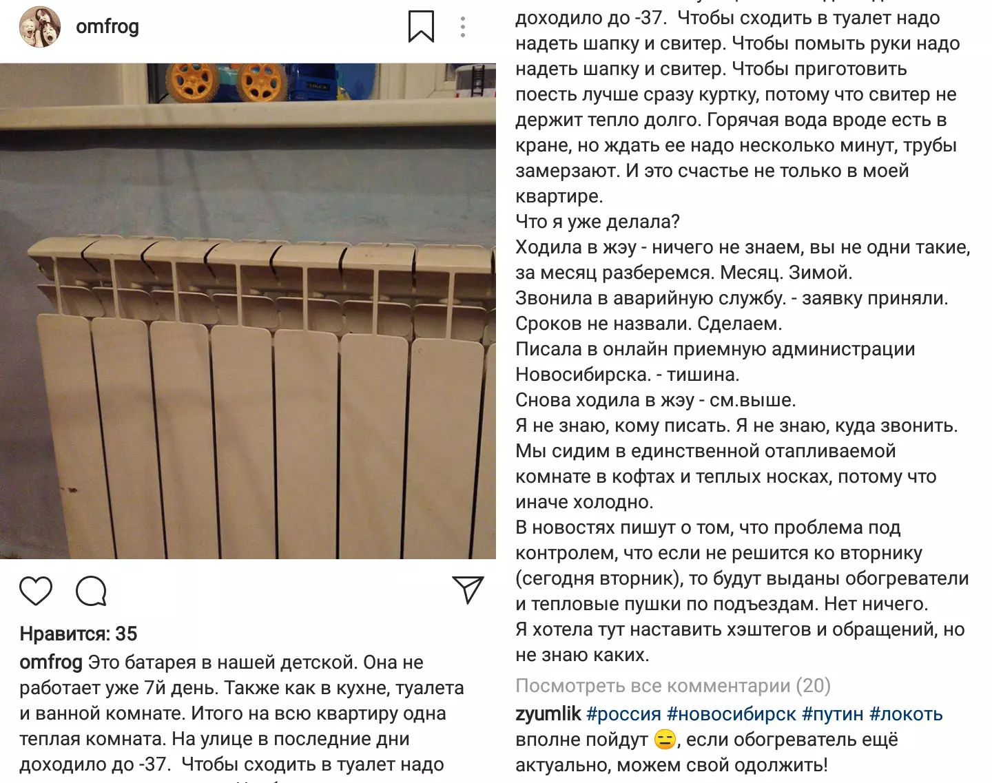 Дом остыл, в квартире стало действительно холодно — обогреватели уже не справлялись, чтобы попасть в туалет, приходилось надевать шапку и куртку, дети заболели. Вся семья жила в одной комнате, где была единственная работающая батарея. На ночь выходных дети отправились к бабушке, а Наталья начала писать куда только возможно: еще одну заявку в аварийную службу, послания новосибирскому мэру Анатолию Локтю в его аккаунт “Вконтакте”, обращение в администрацию Кировского района, в администрацию президента, посты в своем инстаграме…