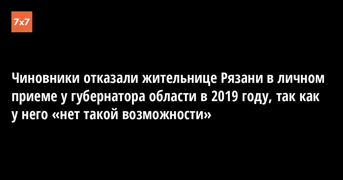 Жительница Рязани Елена Водянова сообщила «7x7», что в аппарате правительства Рязанской области отказали ей в личном приеме у губернатора Николая Любимова в 2019 году, так как у него «такой возможности нет». Об этом интернет-журналу 2 января сообщила сама Водянова.