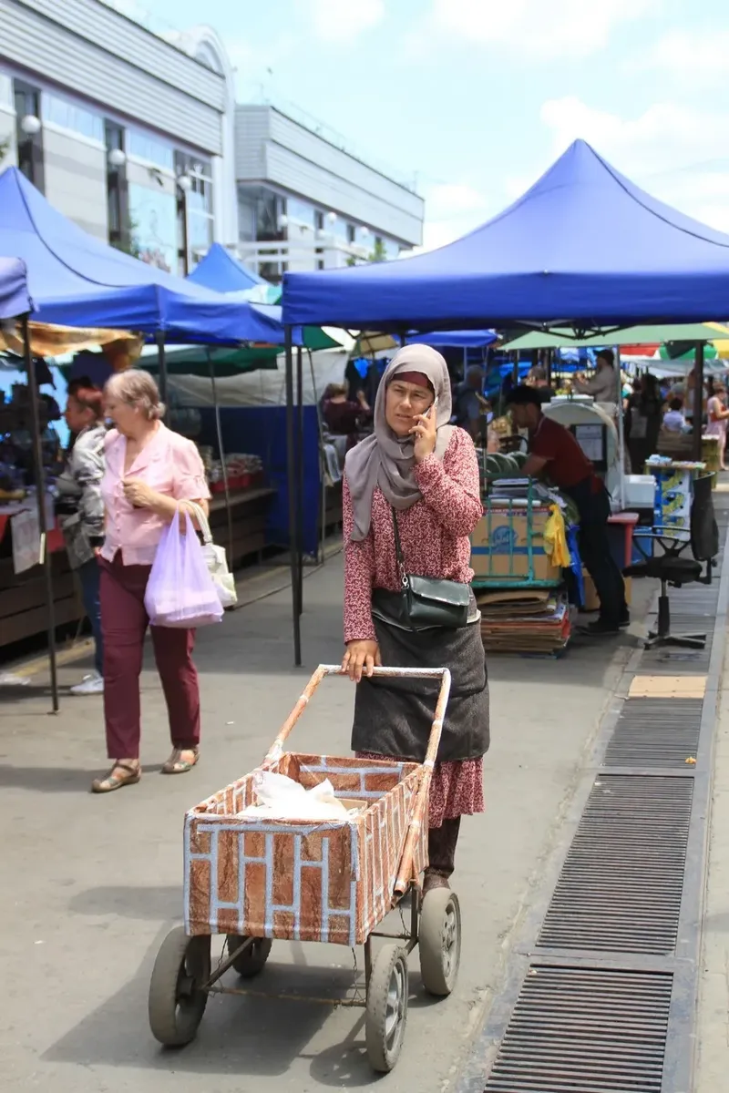 Иркутск, Центральный рынок. Остатки деревянного зодчества перемешаны со стеклянными коробками торговых центров и скоплениями палаток и ларьков, выросших на месте некогда огромной «Шанхайки » - необъятного рынка китайских товаров. Сейчас из китайцев здесь можно встретить лишь приехавших посмотреть на Байкал туристов. Рынок же стал местом жизни и работы мигрантов из Средней Азии. Вокруг шумно, пахнет едой и выхлопными газами. Узбекские дыни соседствуют с клубникой из Байкальска, яркие халаты и тюбетейки — с копиями кроссовок Адидас и сумок Луи Виттон. Рядом продают жвачку из кедровой смолы, Байкальский чай и носки из шерсти яка. Русская речь и столь любимая московскими арендодателями славянская внешность теряются в многообразии языков, лиц и национальной одежды. Живут и работают здесь, в осдновном, узбеки, таджики и киргизы. Истории у всех разные: кто-то вырос в Иркутске, говорит по-русски без акцента и на родину не собирается, а кто-то приехал на заработки и даже не пытается учить язык, планируя через несколько месяцев вернуться домой.