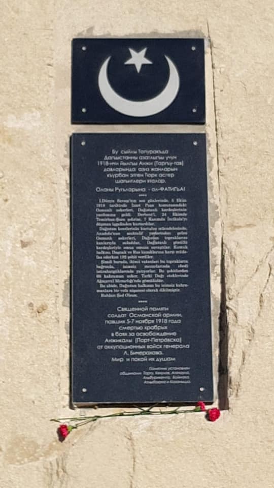 "Священной памяти солдат Османской армии, павших 5-7 ноября 1918 года смертью храбрых в боях за освобождение Анжи-калы (Порт-Петровска) от оккупационных войск генерала Л. Бичерахова. Мир и покой их душам".