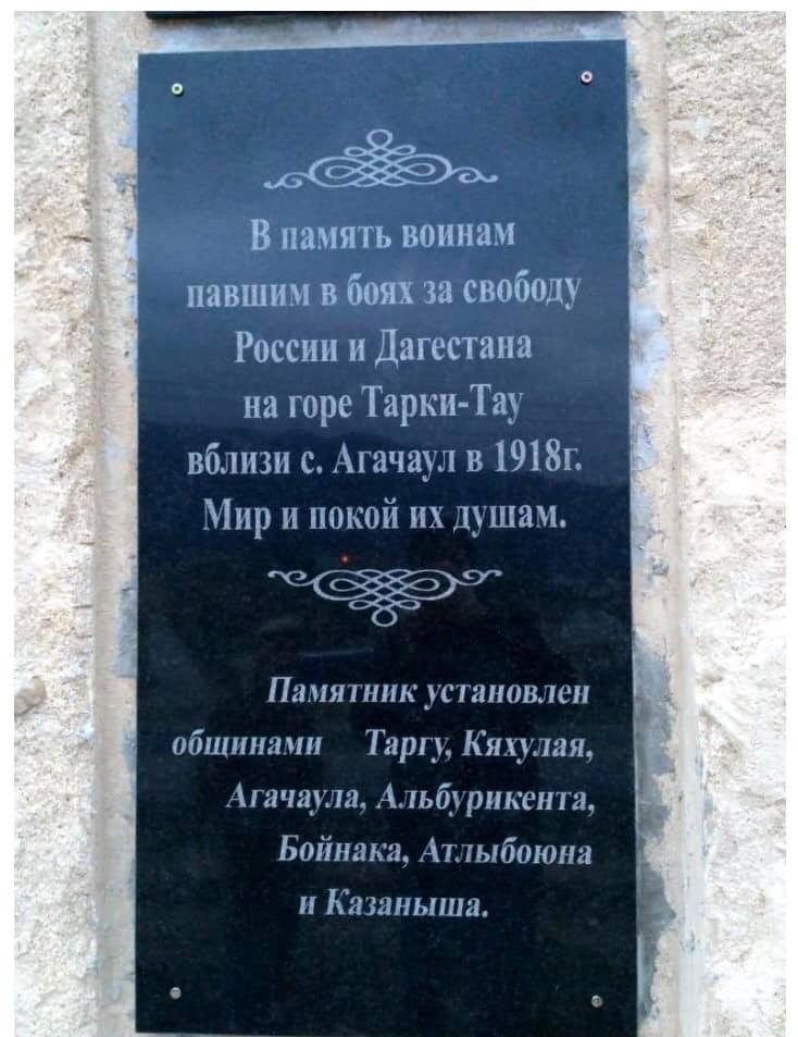 "В память воинам, павшим в боях за свободу России и Дагестана на горе Тарки-Тау вблизи селения Агачаул в 1918 году. Мир и покой их душам".