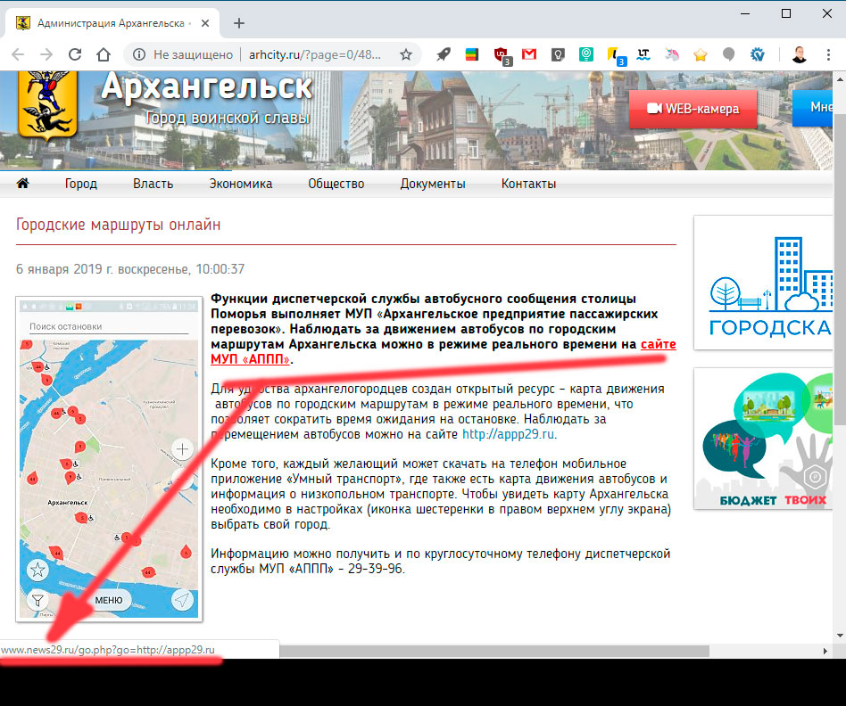 Новость от 6 января 2019, в первом абзаце жирная ссылка «сайте МУП «АППП» которая ведёт нас … на сайт news29.ru, а от туда уже перекидывает на сайт http://appp29.ru.