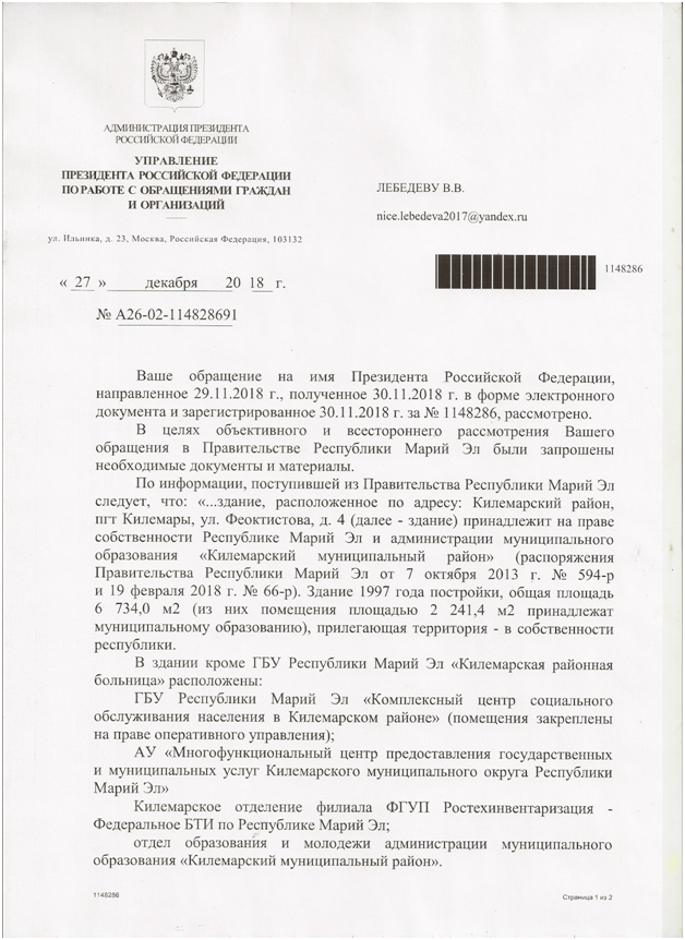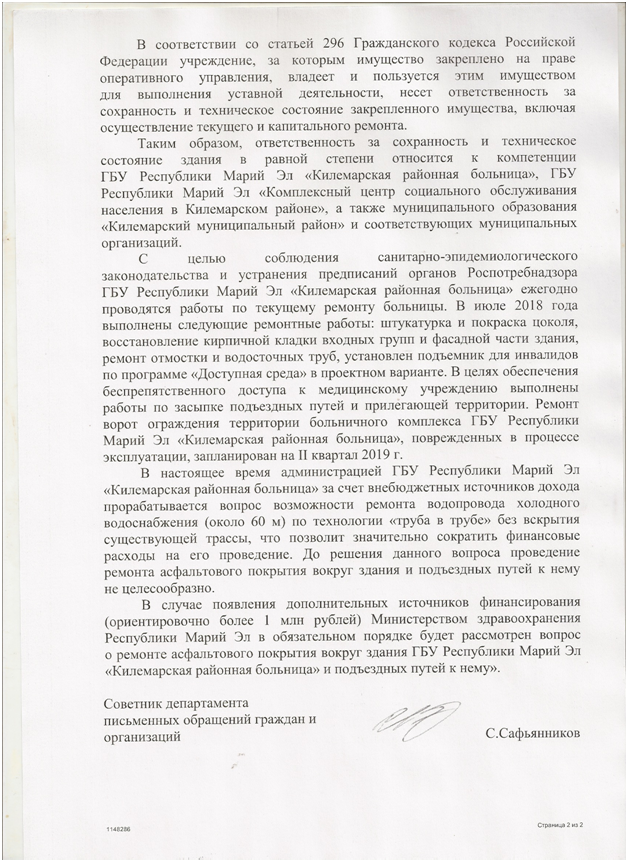 Я много писал о состоянии нашей больницы в поселке Килемары, а именно о его плачевном состоянии. По этому поводу я обращался в приемную президента России.