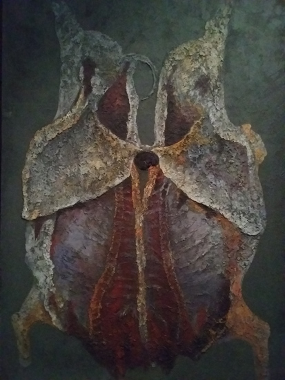 © Анна Борисова Фрагмент модели скульптурной композиции «Короли и палачи» (1995 г., гипс) Между умиротворенным ликом творца и гниющей плотью правителя-палача располагаются другие скульптурные объекты: посмертные маски сильных и гениальных мира сего, коконообразные формы, местами напоминающие кости, слепки высоких сапог-ботфортов, бюсты античных богинь со стертыми лицами, скульптуры рыцарских шлемов и свечные оплывы, спонтанно приобретшие различные причудливые формы, которые нужно только увидеть. Вообще умение смотреть и видеть — ключ к лучшим примерам искусства Шемякина. Они в принципе не требуют текстов и объяснений, только визуального внимания и готовности вспоминать архетипические образы и понятия. Например, лейтмотив второго, самого впечатляющего, зала выставки — плоть как вместилище и как бренная оболочка. Картины и графика с изображениями сосудов и коконов 1990-х (сосуд божий — человек, кокон как символ зарождения жизни и перерождения, а одновременно и отсылка к образу смирительной рубашки) контрастируют с тремя живописными полотнами 1980-х, изображающими развороченные мясные туши. По тому же принципу выстроен контраст между скульптурами — подвешенные к потолку коконы 2000-х соединены с медными натюрмортами 1990-х с черепами и гниющими фруктами.