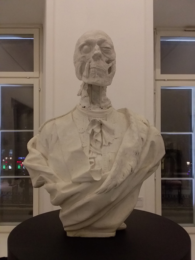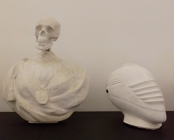 В-третьих, спорным кажется само название выставки — «Метафизическая мастерская», — которое соответствует лишь первой, меньшей и лучшей, части экспозиции. Эта часть начинается с зала, где доминирует тема скульптуры и смерти. Форма и ее распад, целостность и гниение, скульптура как память об ушедшем. Здесь вспоминаешь о том, что искусство издревле рождается из травмы и ощущения утраты. На одной стороне зала — гипсовая маска самого Шемякина 1987 года с умиротворенно-буддийским выражением лица, а прямо напротив нее, в другой части зала, — гипсовый бюст полуразложившегося правителя в мантии и с кружевным жабо из серии «Короли и палачи» (1995). В тексте к выставке пишут о барочном натюрмортном жанре «ванитас» (суета сует, бренность бытия), но странно не вспомнить и не рассказать зрителям о надгробной скульптуре в жанре «транзи», когда человек изображался полуразложившимся (причем довольно натуралистично).