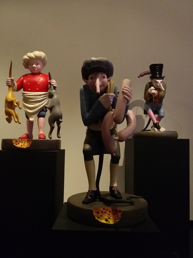 Во-вторых, Шемякин — автор известных памятников, которым на выставке почти не уделено внимания, кроме слайд-шоу на маленьком экране в одном из финальных залов, и это является огромным минусом.