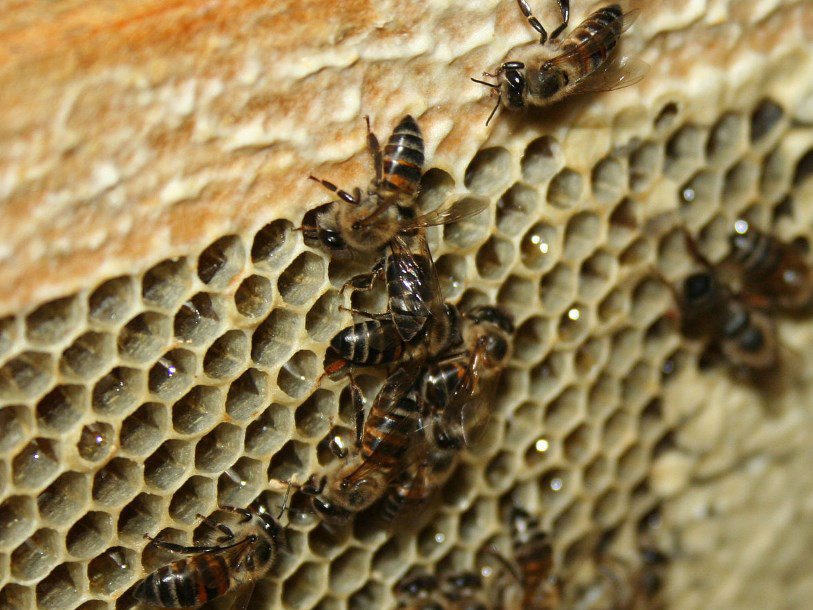 Пчелы Apis mellifera capensis (с черными брюшками) в гнезде пчел A. m. scutellata. Фото: Mike Allsopp