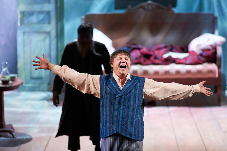 Это точка сборки спектакля. Декорация великого Сергея Бархина — театральная коробочка, меблированные комнаты, которые что в городе, что на даче одинаковые: диван, столик, бюро из палисандрового дерева. В этой подробной театральной обстановке происходит вся мертвечина. Весь морок обломовской жизни. Сон, клопы, мыши, пыль.
