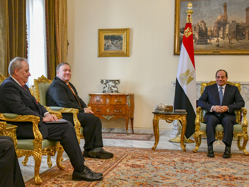 Помпео прибыл в Каир в среду вечером в рамках ближневосточного турне из Ирака, где он сделал не запланированную ранее остановку. Утром он провел переговоры с президентом Египта Абдель Фаттахом ас-Сиси. Как заявил официальный представитель главы республики Бассам Рады, на них египетский лидер "подчеркнул глубину стратегического партнерства между двумя странами и важность продолжения координации и совместных консультаций по политическим вопросам и вопросам безопасности в регионе".