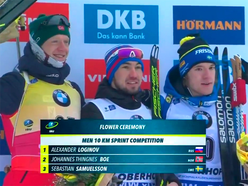 Второе место с отставанием 25,2 секунды и одним промахом занял лидер общего зачета Кубка мира норвежец Йоханнес Бе. Тройку призеров замкнул швед Себастьян Самуэльссон. Как и Логинов, он не промахнулся ни разу, но уступил россиянину 36,8 секунды.