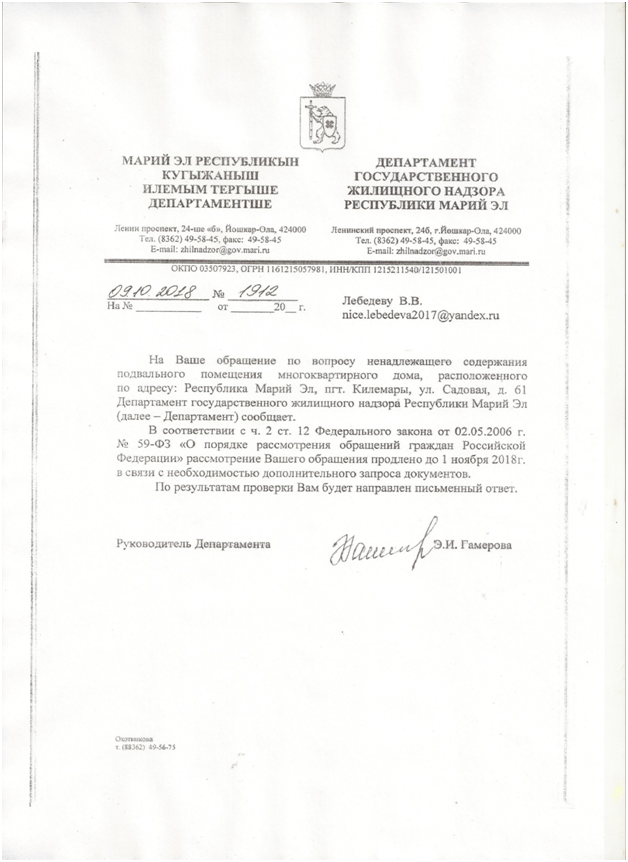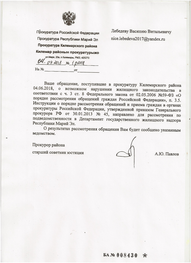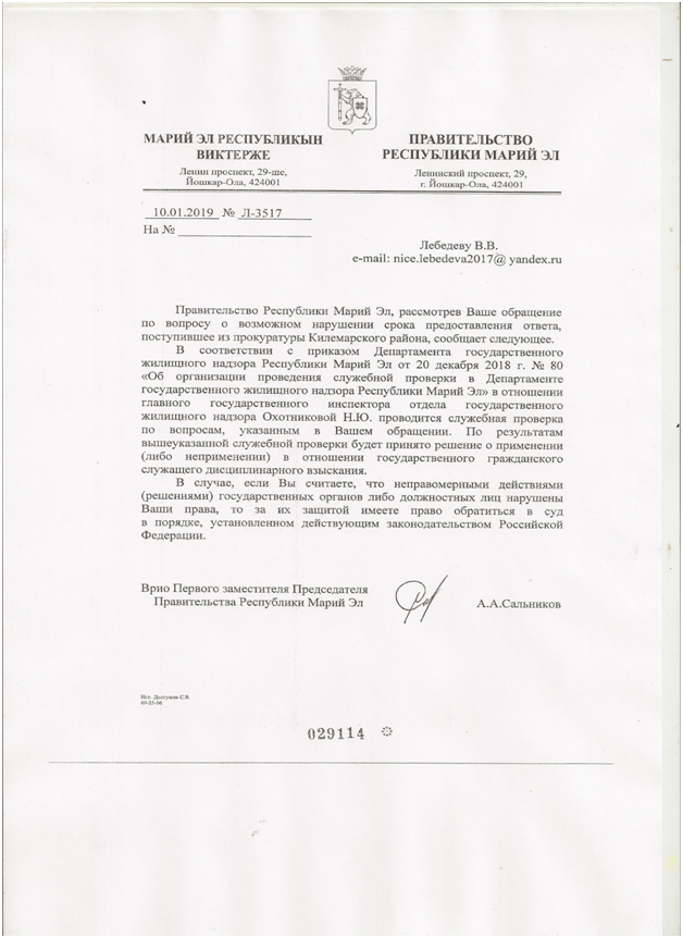 Вскоре я получил ответ от Департамента государственного жилищного надзора Республики Марий Эл.