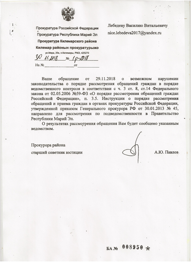 На этом все и затихло. Я был вынужден 29.11.18 обратиться в Килемарскую прокуратуру .