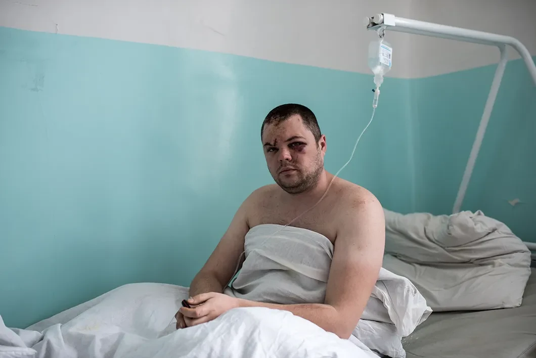 Кирилл Лариков лежит в палате интенсивной терапии. Ему меняют капельницы — одну за другой. Через час операция — заново формировать слезный канальчик на левом глазу. Лицо иссечено бетонными осколками. Тяжелое сотрясение, вставать запрещено.