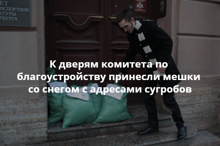 Активисты «Нового двуличия» оставили у дверей комитета по благоустройству Петербурга мешки со снегом и льдом, собранным на улицах города. Об этом сообщается в социальных сетях движения.