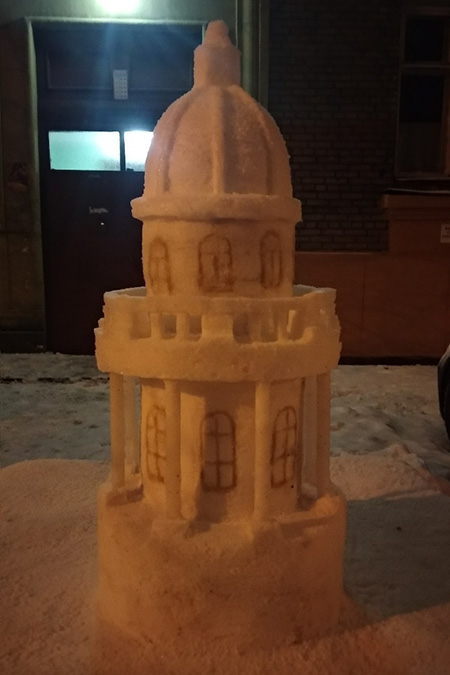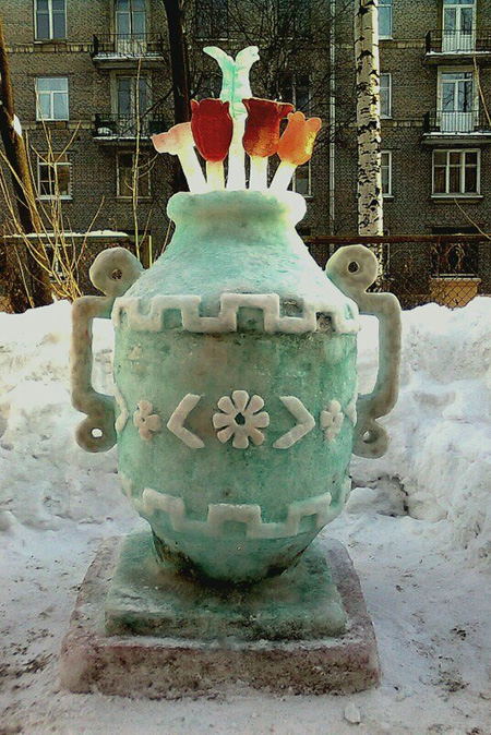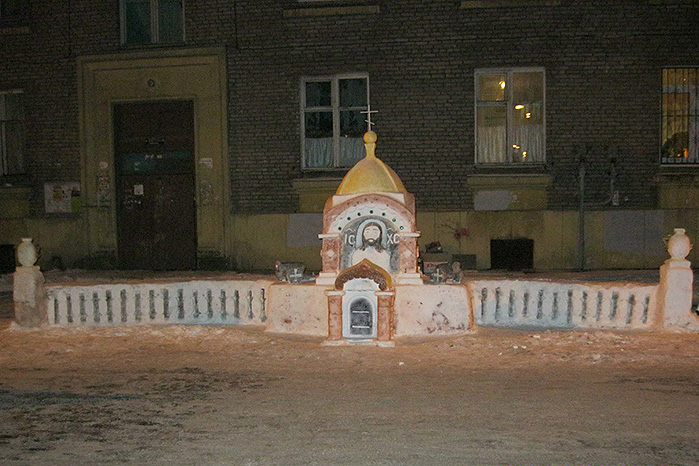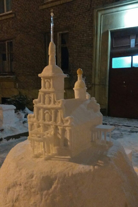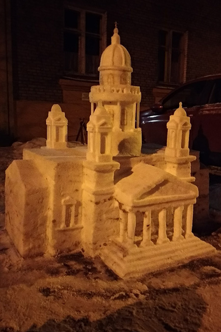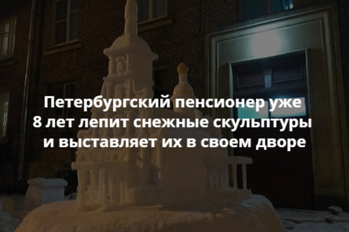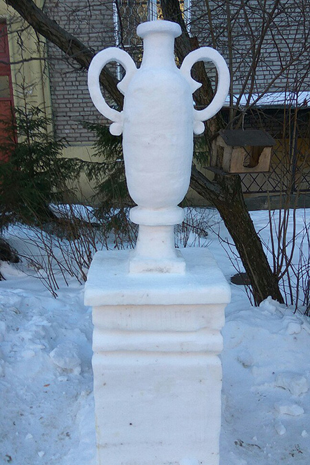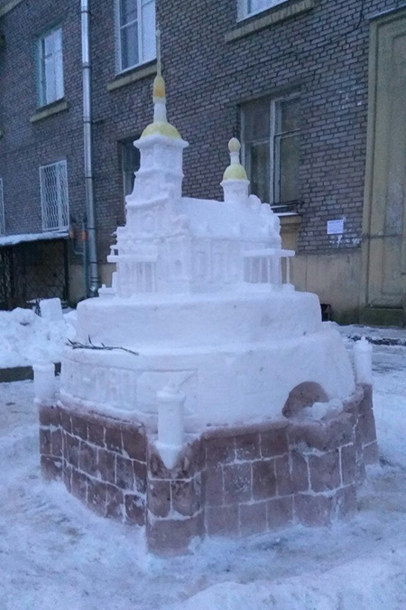 Каждую зиму я создаю как минимум одну композицию во дворе [на Ланском шоссе]. Я делал Спас на Крови, Казанский собор, Ласточкино гнездо, яйцо Фаберже, колонны с вазами на пьедестале. Далеко не всё фотографировал — многие из них просто стояли, а потом таяли. В 2011 году одна из скульптур победила в каком-то районном конкурсе, и мне заплатили 5 тысяч рублей. Это был единственный раз, когда я получил плату за работу.