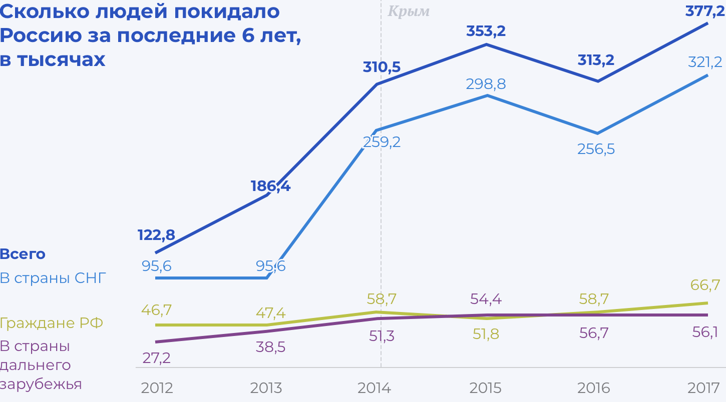 Выросло не только общее число уехавших (вместе с трудовыми мигрантами), но и число тех, кто уехал в страны дальнего зарубежья. Что касается граждан России — ситуация такая же. В 2017 году выбыло почти в два раза больше граждан России, чем в 2012 году. Всего за третий срок президентства Путина из России уехало 1,7 млн человек — только по оценке Росстата.