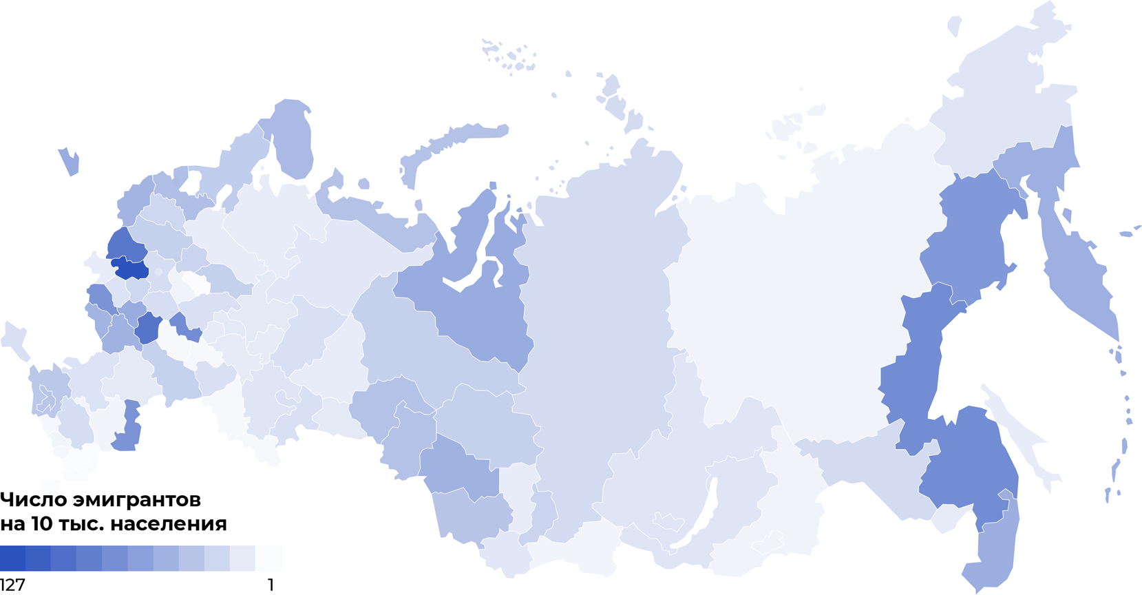 В последние годы в эмиграцию вовлекаются все больше регионов России. К Москве и регионам, имеющим границу с другими государствами, подтягиваются менее благополучные регионы. Если в 2001 году доля эмигрантов из Москвы и Санкт-Петербурга в общем количестве составляла 26%, то в 2017 году она снизилась до 11%. Первые места по числу выбывших в пересчете на численность населения занимают Калужская, Тамбовская, Смоленская области, Хабаровский край и Республика Мордовия — это срединные регионы в рейтинге субъектов России по ВРП.
