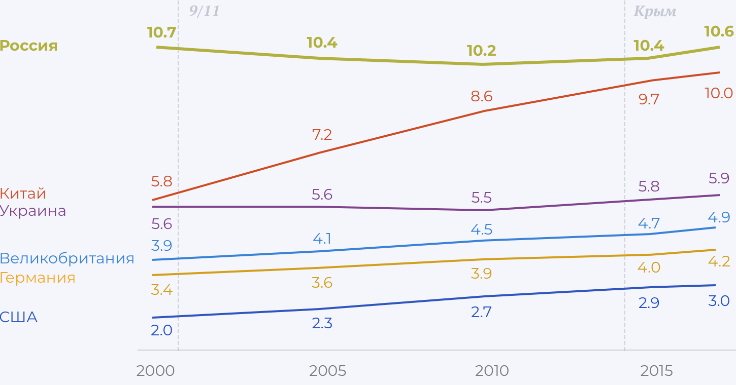 Для сравнения — на первом месте по числу эмигрантов находится Индия с 16,6 млн человек, на втором Мексика с 12,9 млн человек. Россия обгоняет самую густонаселенную страну: Китай покинуло 9,9 млн человек, пятым идет Бангладеш — 7,5 млн эмигрантов. Обгоняет Россия и неблагополучные страны с большим числом вынужденных мигрантов: в первую десятку попали Сирия, Пакистан и Украина.