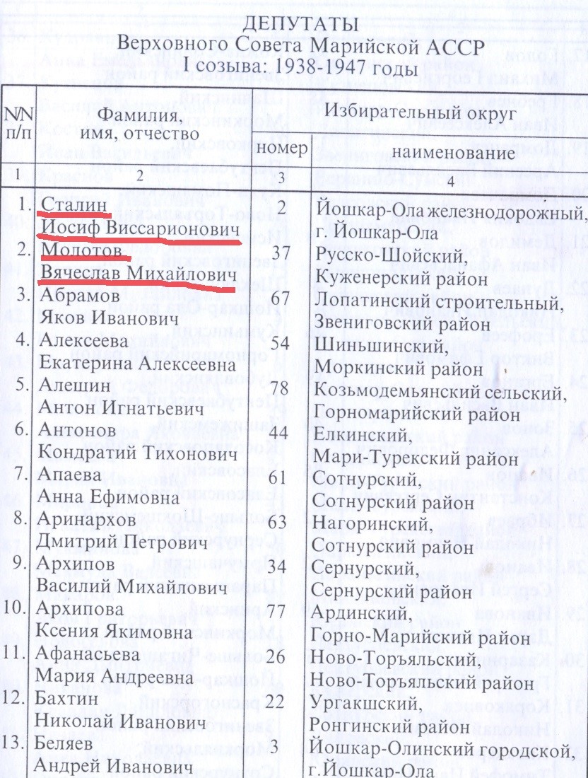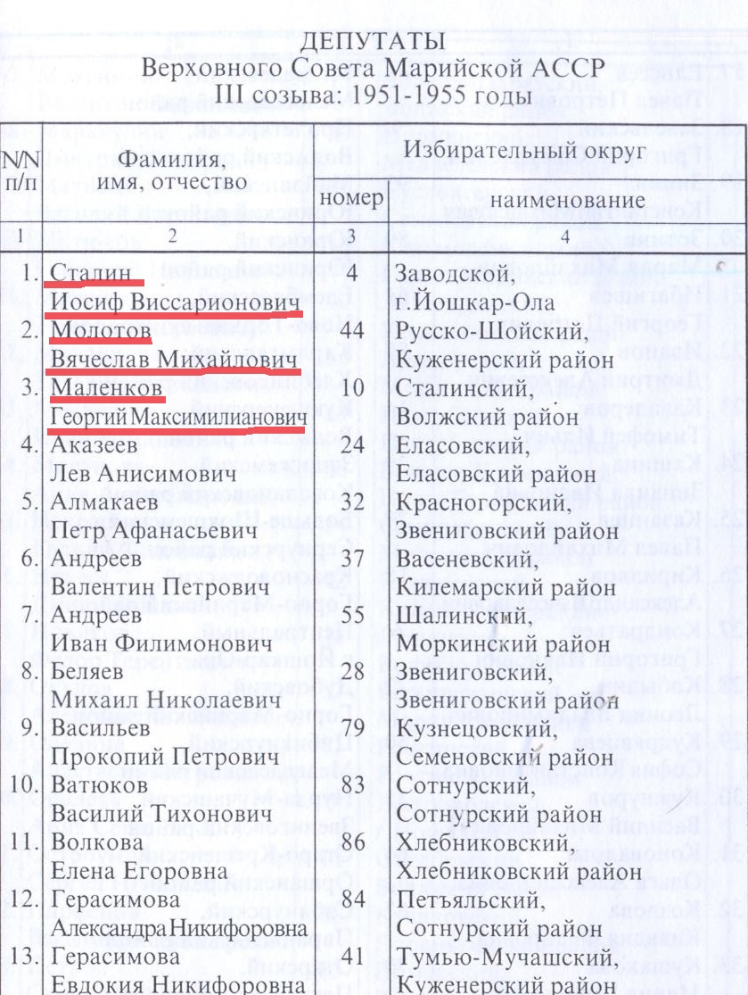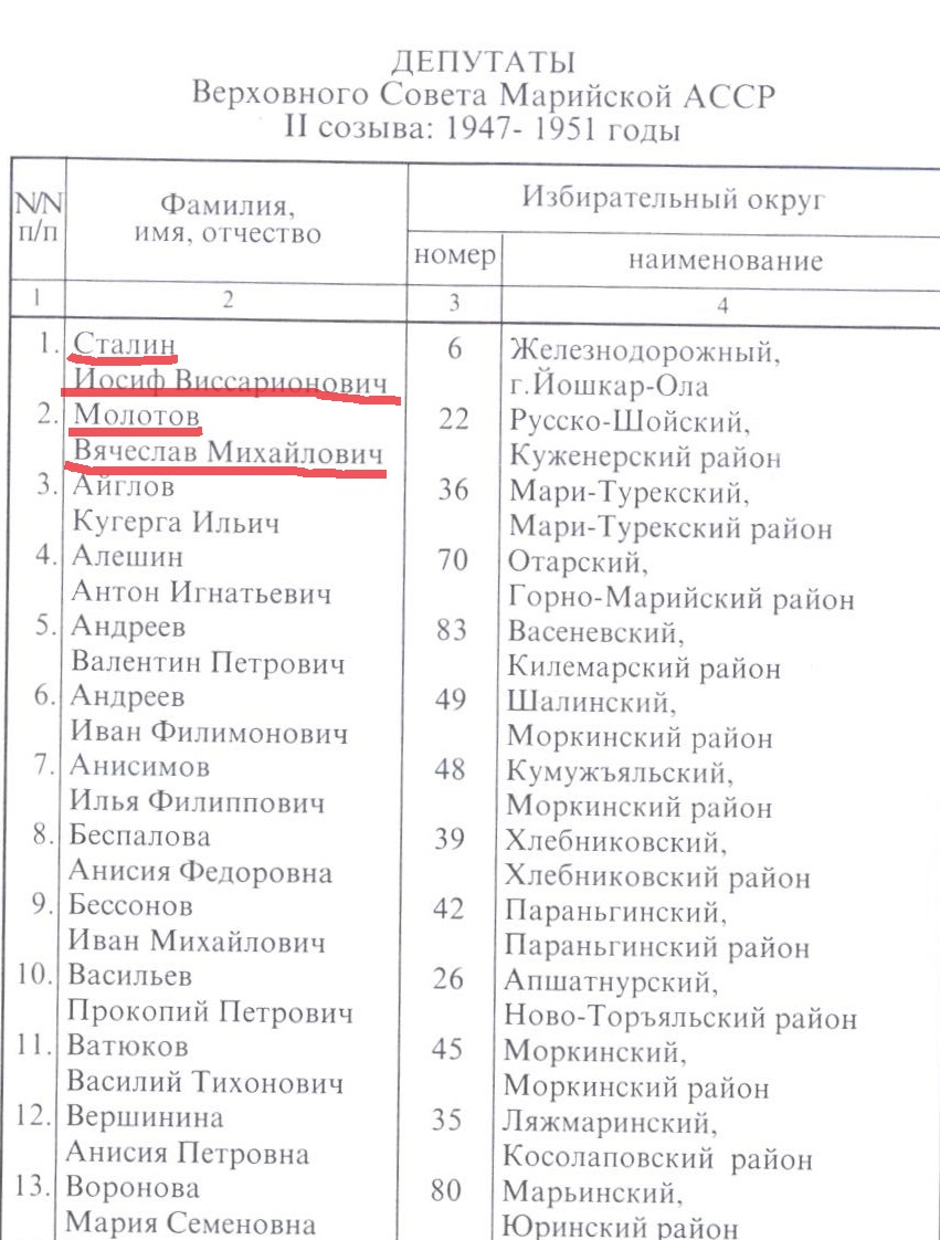 Мало кто знает, что руководители Советского Союза, помимо того, что рулили советской страной, были еще и депутатами Марийской республики. Так сам тов. Сталин был депутатом Верховного совета депутатов Марийской АССР от Йошкар-Олы в трех созывах подряд с 1938 по 1953 год и умер, что называется, на боевом посту в статусе депутата от Йошкар-Олы. Кроме него, трижды с 1928 по 1955 год марийским депутатом побывал тов. Молотов и единожды в третьем созыве с 1951 по 1955 следующий после Сталина номинальный руководитель СССР тов. Маленков.