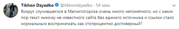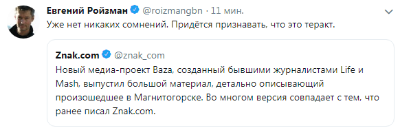 Также сегодня была распространена версия-расследование telegram-канала, автором публикации которого, как сообщают СМИ, стал основатель telegram-канала Mash Никита Могутин: в расследовании приводятся доказательства, что в Магнитогорске был совершен именно теракт. В качестве одного из основных доказательств приводится звонок некоего свидетеля в службу 112, в котором он говорит, что автомобиль въехал в арку и взорвался. Однако позже автор сообщает, что из разговора со свидетелем, позвонившим в 112 следует, что он не знает, был ли взрыв или нет: он видел, как проехал автомобиль, а вслед за этим обвалился подъезд. Следов автомобиля найдено не было. По версии telegram-канала, в Магнитогорске планировалась целая серия терактов, но каких-либо источников автор публикации не приводит.
