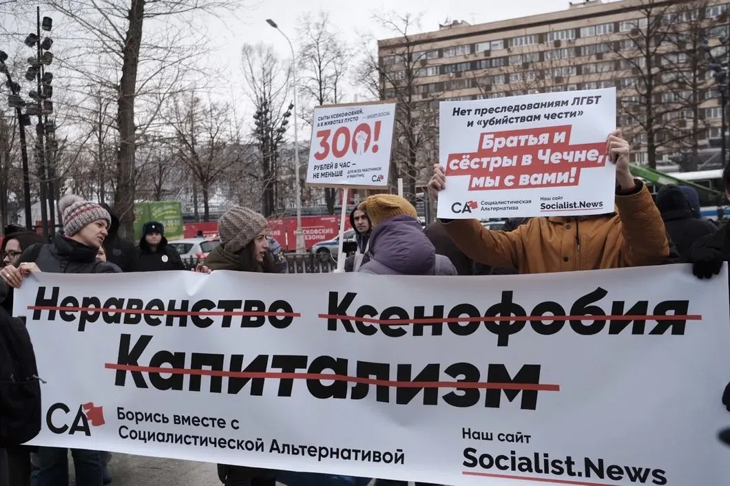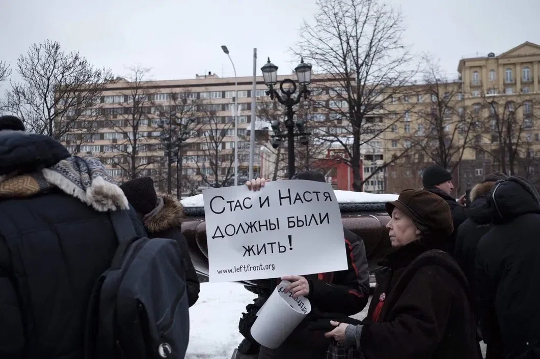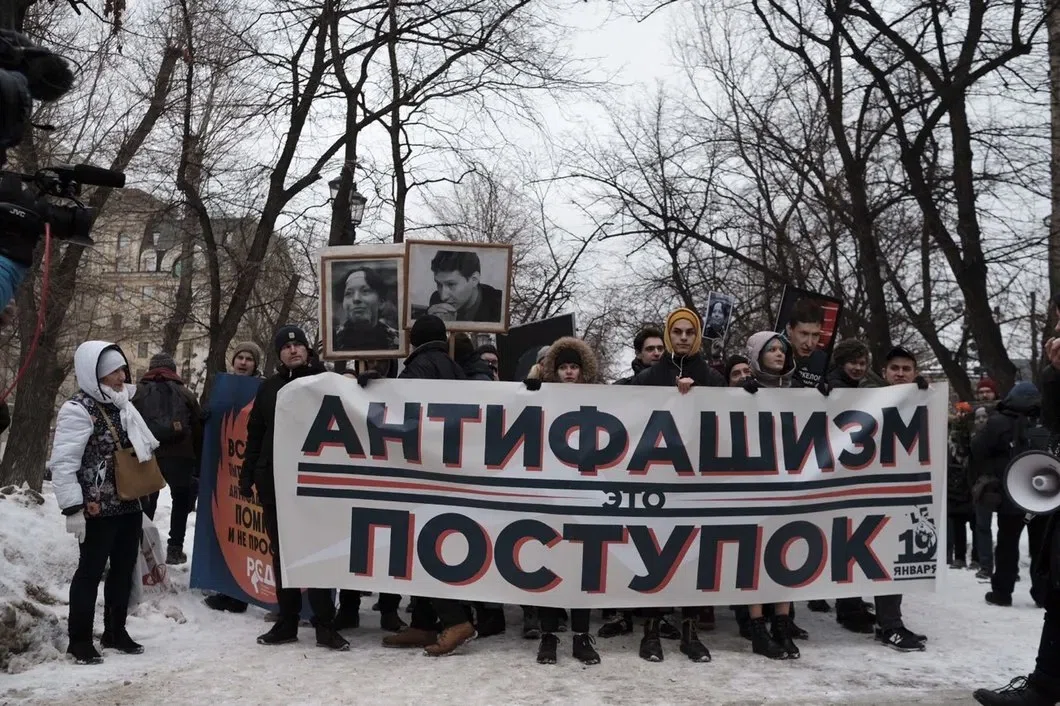 Участники акции скандируют: «Наше отечество – все человечество», «Антифашизм не преступление», «Стас и Настя должны были жить», «Вечная память Стасу Маркелову! Вечная память Насте Бабуровой!».