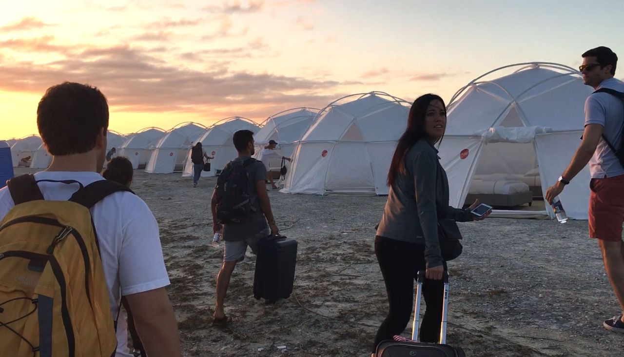 Первые самолеты с посетителями фестиваля начали прилетать на остров ранним утром 27 апреля. Вместо обещанных «элитных чартеров» покупатели билетов летели на огромных «Боингах»; когда они приземлились, их отвезли в ресторан на другой конец острова, обещая позже перевезти на площадку. Приехали они туда вечером — и обнаружили, что их жилье представляет собой не роскошные виллы, а палатки вроде тех, куда селят жертв стихийных бедствий. Внутри лежали матрасы в мокром полиэтилене. Багаж на площадку привезли в двух огромных грузовиках; где чья сумка, понять было невозможно.
