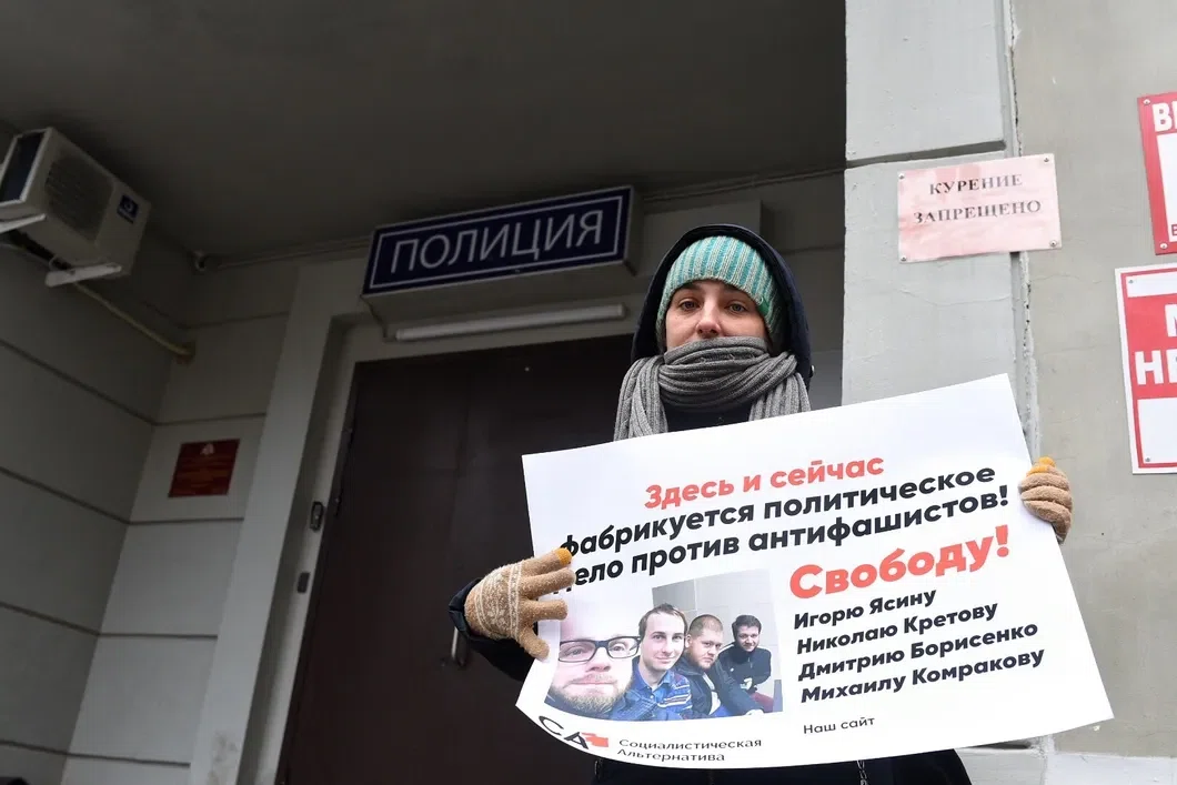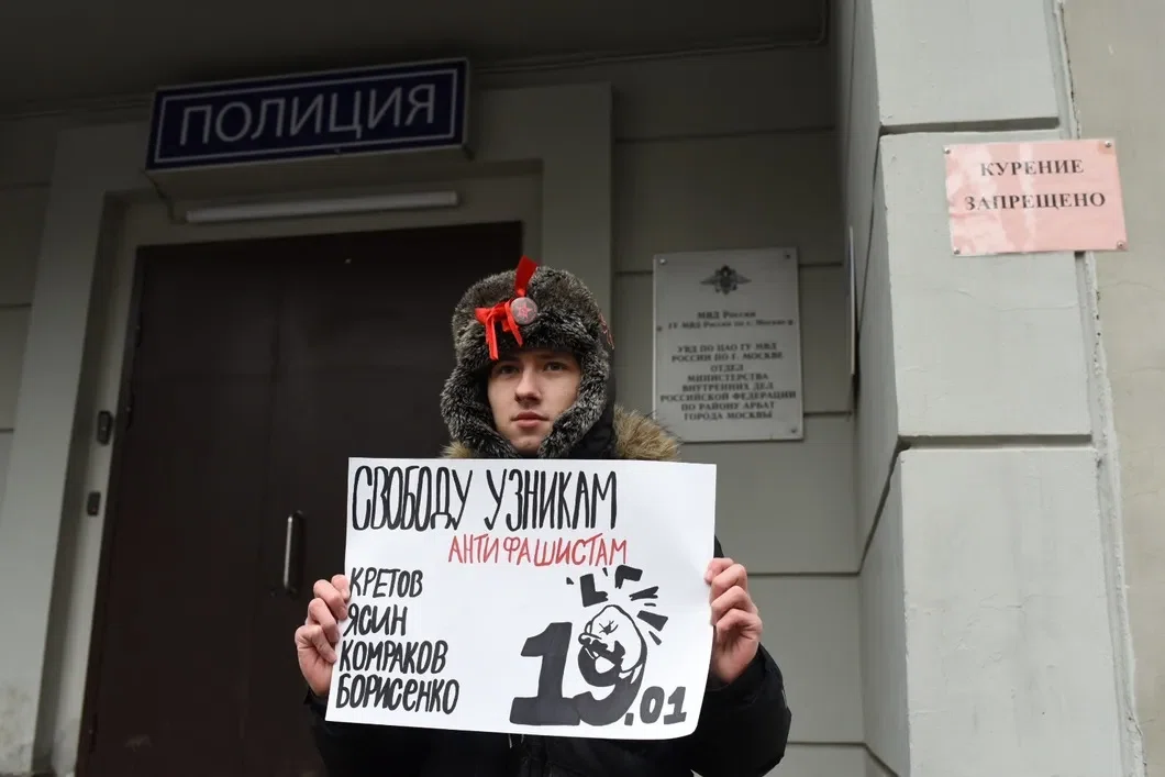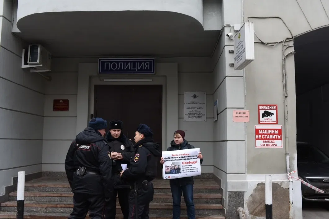 В Москве активисты проводят одиночные пикеты у здания ОВД «Арбат» в поддержку задержанных на акции памяти Станислава Маркелова и Анастасии Бабуровой 19 января.