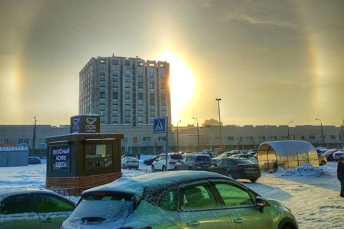 В небе над Петербургом утром 21 января заметили солнечное гало. Фотографии с природным явлением петербуржцы публикуют в соцсетях.