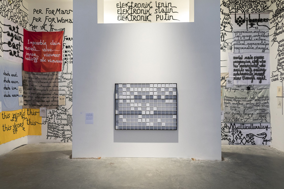 © Peter Snadik Вид экспозиции выставки в Жилине. 2018 Гланц: Иногда и в регулируемой культуре появлялись своего рода островки, которые не были ни частными, ни государственными. Особенно в Югославии подобные «промежуточные пространства» играли важную роль. Например, студенческий культурный центр в Белграде, ставший после 1968 года всемирно известной площадкой для неоавангардистских экспериментов. «Активная поэзия» там была возможна без внутренней и внешней цензуры.