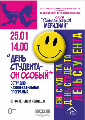 25 января в клубе “Студенческий меридиан” пройдет эстрадно-развлекательная программа “День студента – он особый”.