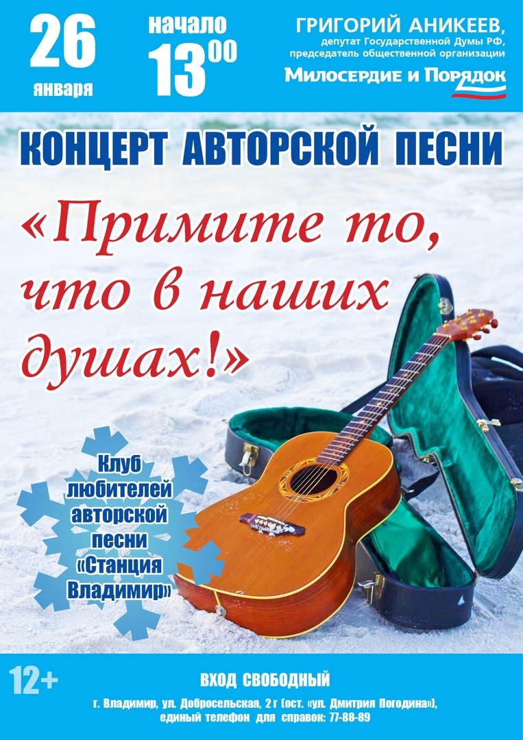 Дата22.01.2019АвторИлья КосыгинИсточникДоводСохранённая копияInternet ArchiveOriginal MaterialShow translationКонцерт авторской песни 26 января на Добросельской, 2г выступят артисты клуба любителей авторской песни “Станция Владимир” с концертной программой “Примите то, что в наших душах!”. Начало – в 13 часов. Вход свободный.