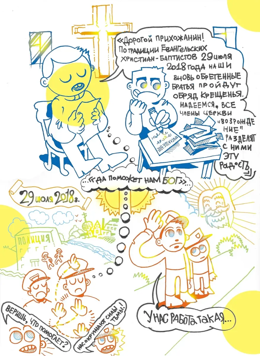 «29 июля я прошлого года в городе Набережные Челны баптистский пастор провел обряд крещения в безлюдном месте на берегу реки Кама в присутствии какого-то количества верующих. За это деяние пастор был привлечен к административной ответственности в виде двадцати тысяч рублей штрафа и, более того, доставлен в суд в наручниках как опасный правонарушитель. Правонарушение заключалось в несоблюдении правил проведения публичного мероприятия.
