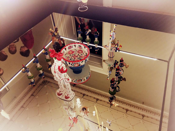 © Надя Плунгян «100+10». Фрагмент экспозиции с коллекцией свистулек разных народов Иногда синий объединен с другими декоративными решениями. Например, в центре зала с театральными портретами художники поместили огромное зеркальное плато, подвесив над ним экспонаты из большой коллекции керамических свистулек VII—XX столетий, приобретенной музеем в 2009 году. Это действительно свободная и остроумная работа с архивом: зеркало удваивает ярко освещенный дождь цветных фигурок, и со стороны он выглядит полноценной инсталляцией. Завершающий первую анфиладу выставки крупный зал с коллекцией костюмов, наоборот, погружен в некоторое затемнение. Экспонаты выстроены на длинном подиуме, неподвижность манекенов подчеркнута видеопроекцией, которая создает впечатление и живости, и историчности происходящего.