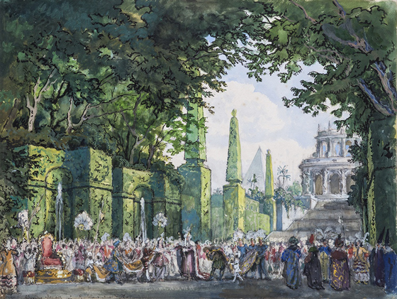 © Санкт-Петербургский государственный музей театрального и музыкального искусства Александр Бенуа. Эскиз декорации к балету «Павильон Армиды» Н.Н. Черепнина. Антреприза С. Дягилева. 1909. Дар Нины Лобановой-Ростовской Среди них — большая архивная часть (например, личные бумаги Сергея Лифаря и певицы Любови Андреевой-Дельмас и полученные в дар в 2018 году документы балерины Илларии Ладре-Обыденной); раздел «реликвий» — личные вещи и автографы театральных деятелей и такие редкости, как перчаточные куклы концертной бригады 1942—1943 годов; раздел редких музыкальных инструментов и портретная галерея артистов и режиссеров послевоенных лет — от фотографии до живописи. Заметный сегмент выставки принадлежит костюмам. Здесь можно увидеть повседневные платья и сценические костюмы Майи Плисецкой, сшитые для нее Пьером Карденом, и реконструкции костюмов к балетам «Павильон Армиды», «Петрушка» и «Умирающий лебедь», созданные в 1990-х хореографом, художником и танцовщиком Никитой Долгушиным.